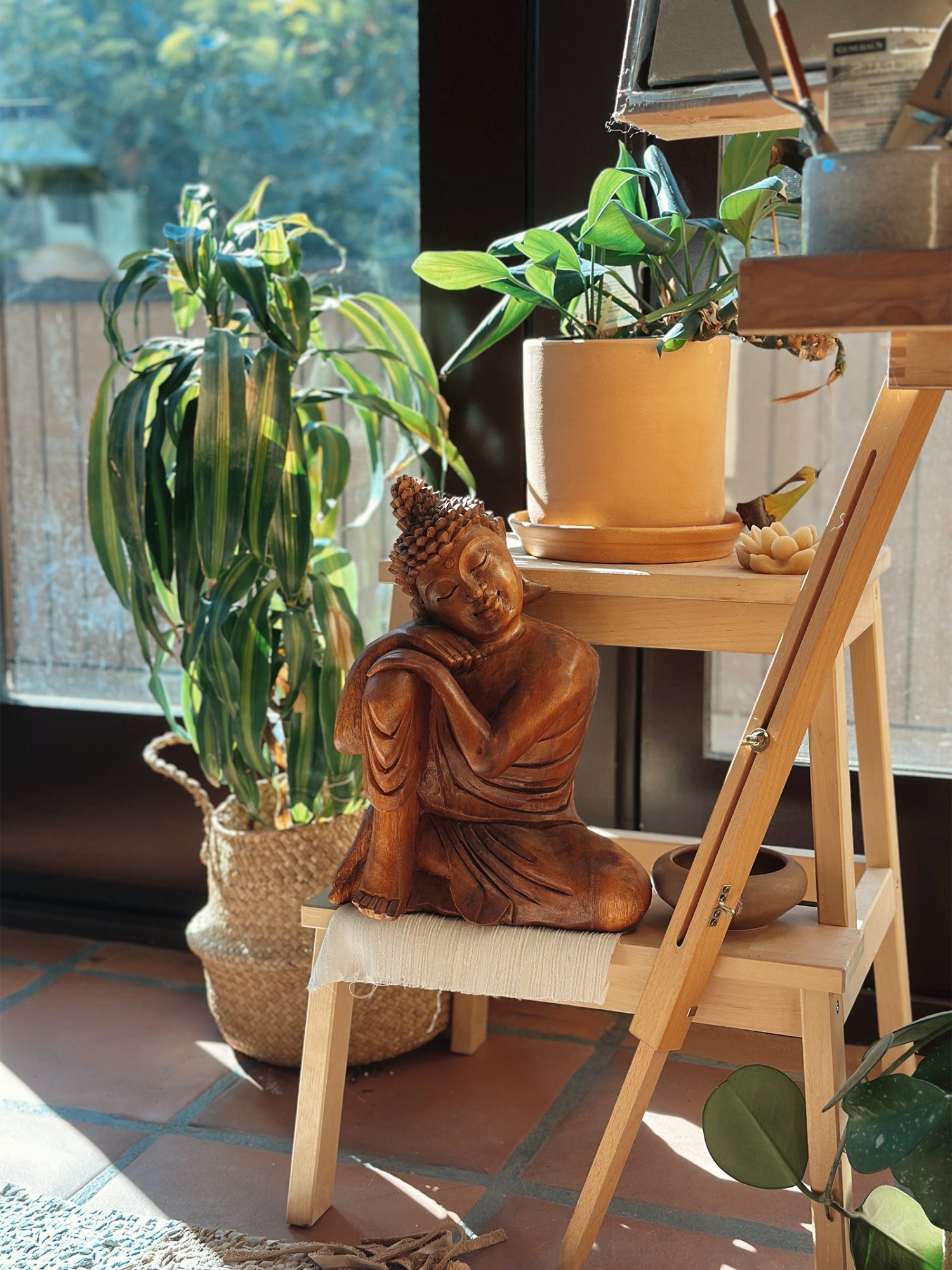 My studio is filled with things that inspire me—mostly books, natural objects, and trinkets from my travels. I also keep a wooden Buddha statue and a small meditation space that brings me a lot of calm and joy.
