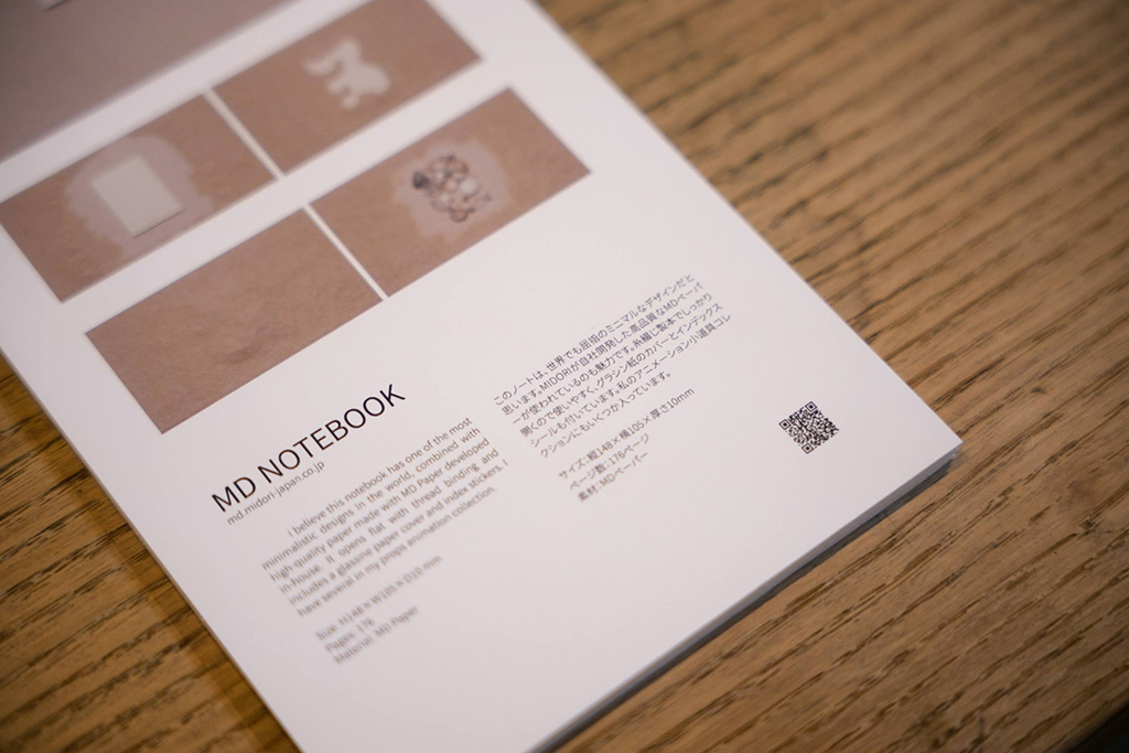 その後も、『MDノート』を使ったアニメーションを何本か制作し、今回の展覧会用の作品も含まれています。また、プロップ(小道具)としてコレクションにも加えたので、美しいノートを使いたいシーンがあれば、必ず『MDノート』を使わせていただいています。